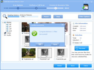 Card Recovery Pro 2.9.9 нь устсан файлыг мемори картнаас сэргээдэг программ юм. Тодруулвал мемори картан дахь файлыг (дуу, зураг, видео г.м) устгасан, мемори картыг формат хийсэн, картын системд алдаа гарсан, вирусны халдлаганд өртсөн гэх мэт тохиолдлуудын таны файлыг сэргээх юм. Уг программ нь SD Card(Secure Digital card), MicroSD (TransFlash), SDHC, miniSD card болон бусад картаас файл сэргээх чадвартай. Хэмжээ нь: 6 мб